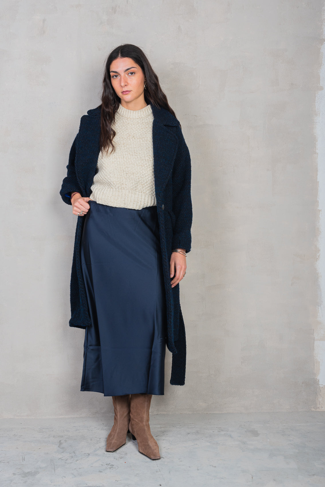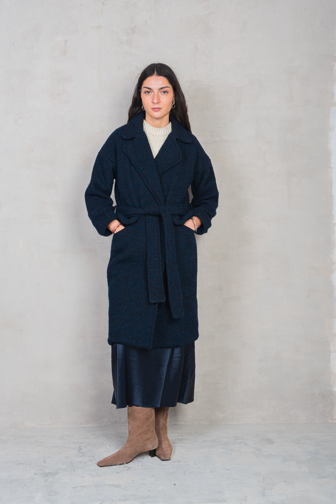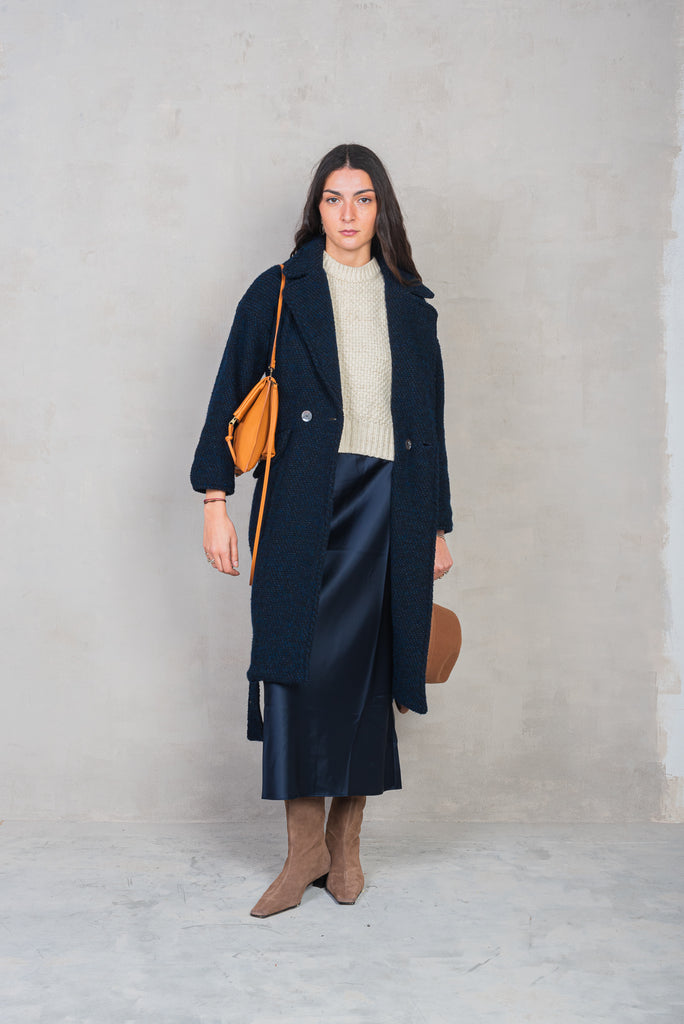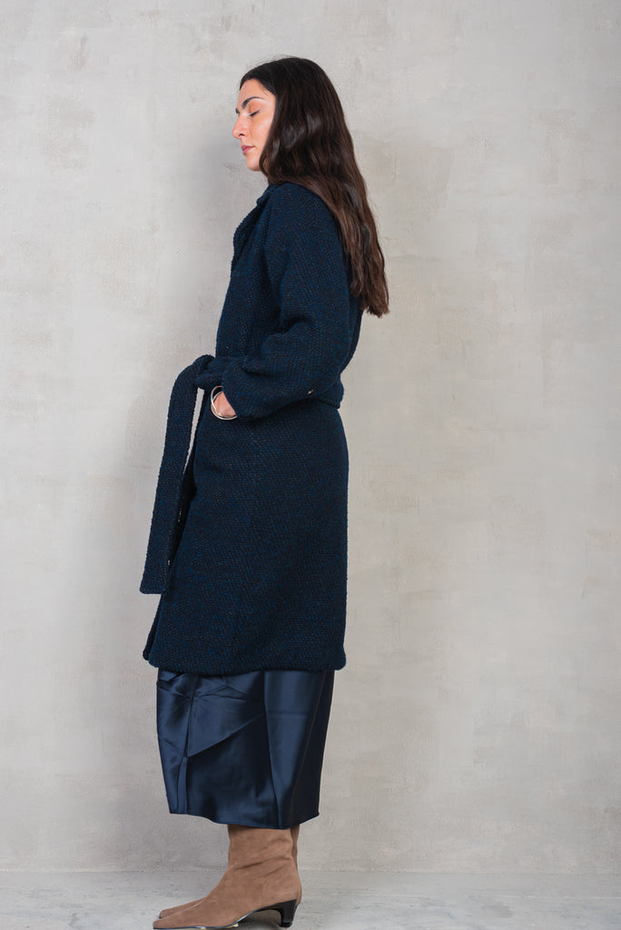 Cappotto lungo leggermente svasato realizzato artigianalmente in lana. Maniche lunghe, tasche inserite nei fianchi e cintura rimovibile.