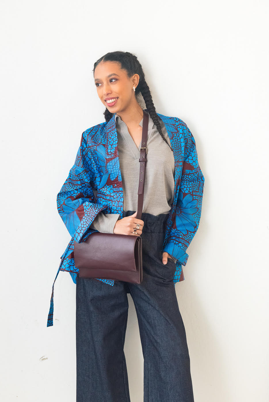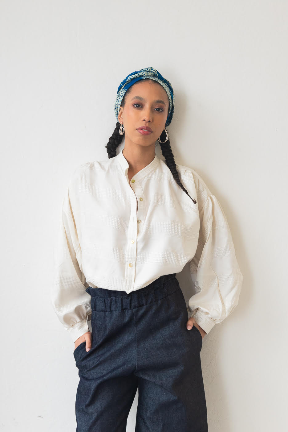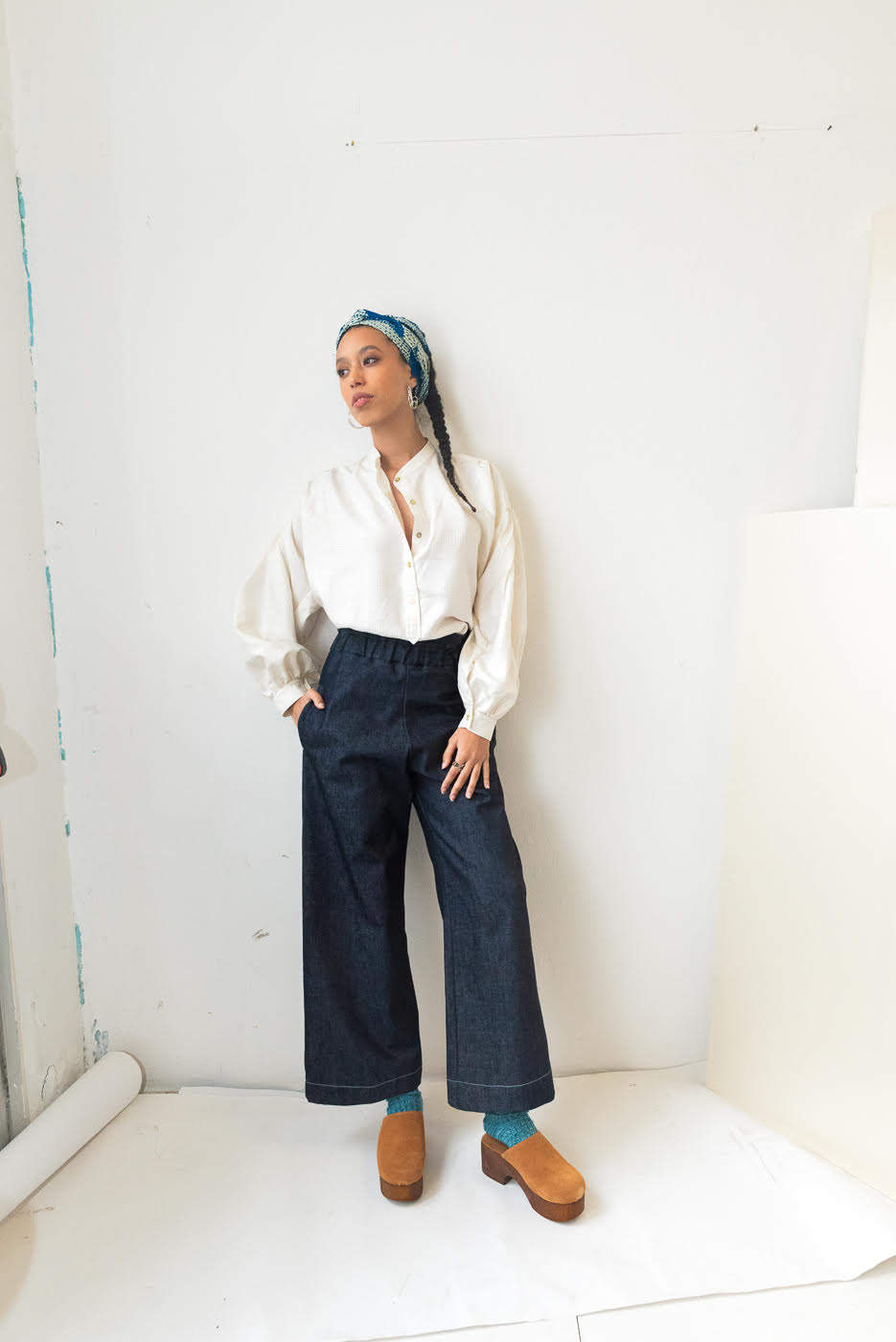 Il pantalone a vita alta in denim è caratterizzato da una gamba ampia e da un elastico in vita. Le tasche sono profonde e foderate di Cotone Wax.