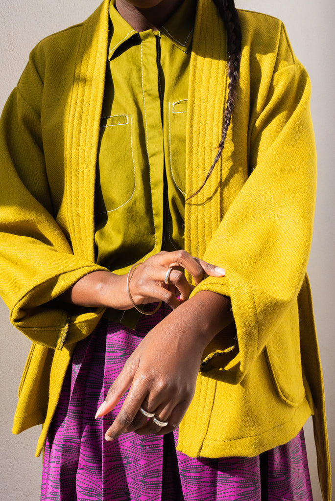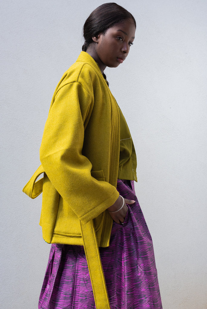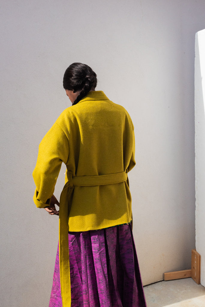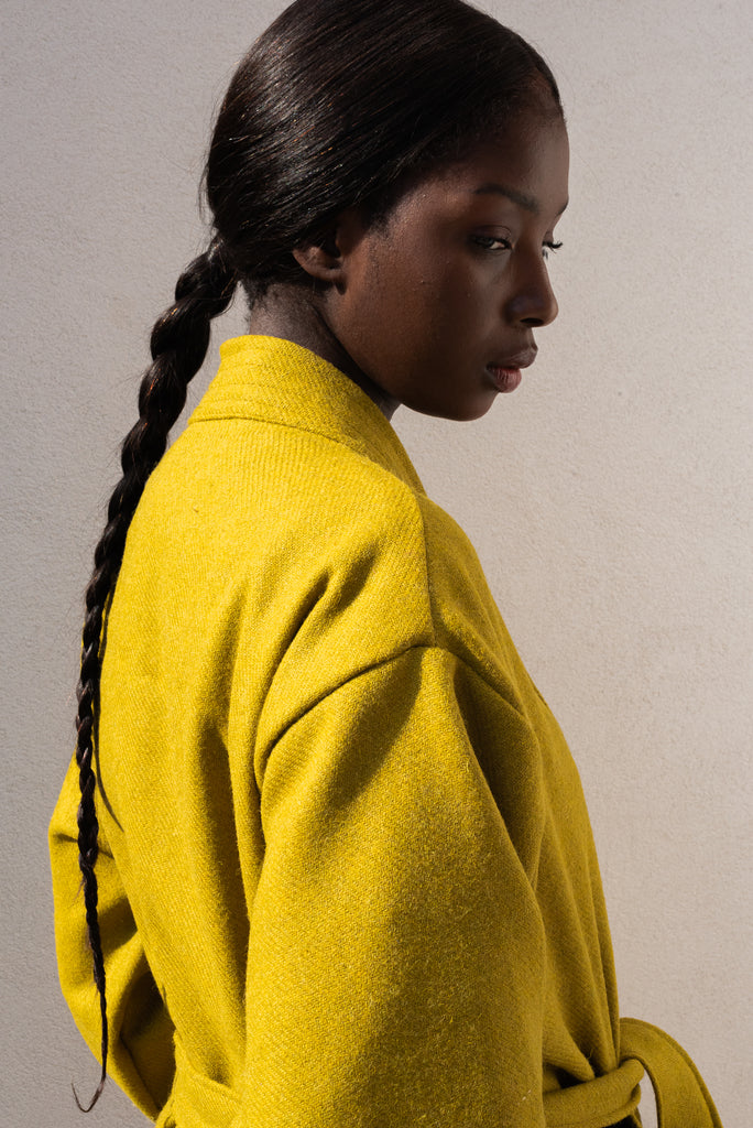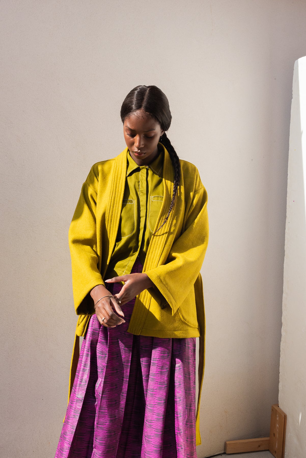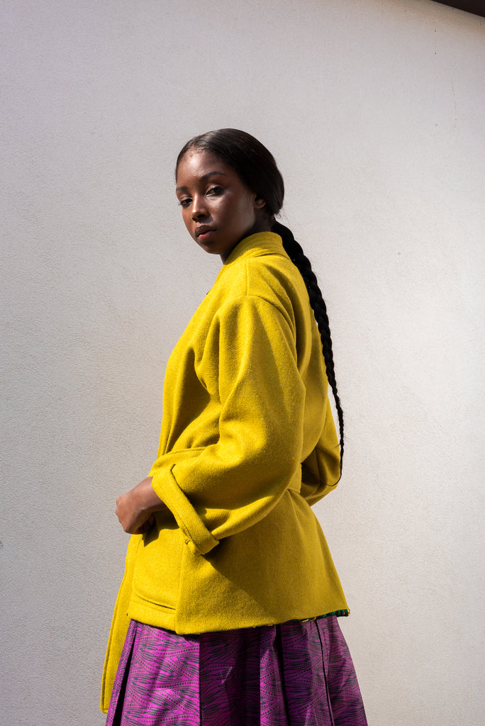 Giacca realizzata sul modello di un kimono con cintura e due tasche anteriori. La sua composizione esterna è in lana e il suo interno è in Cotone Wax.
