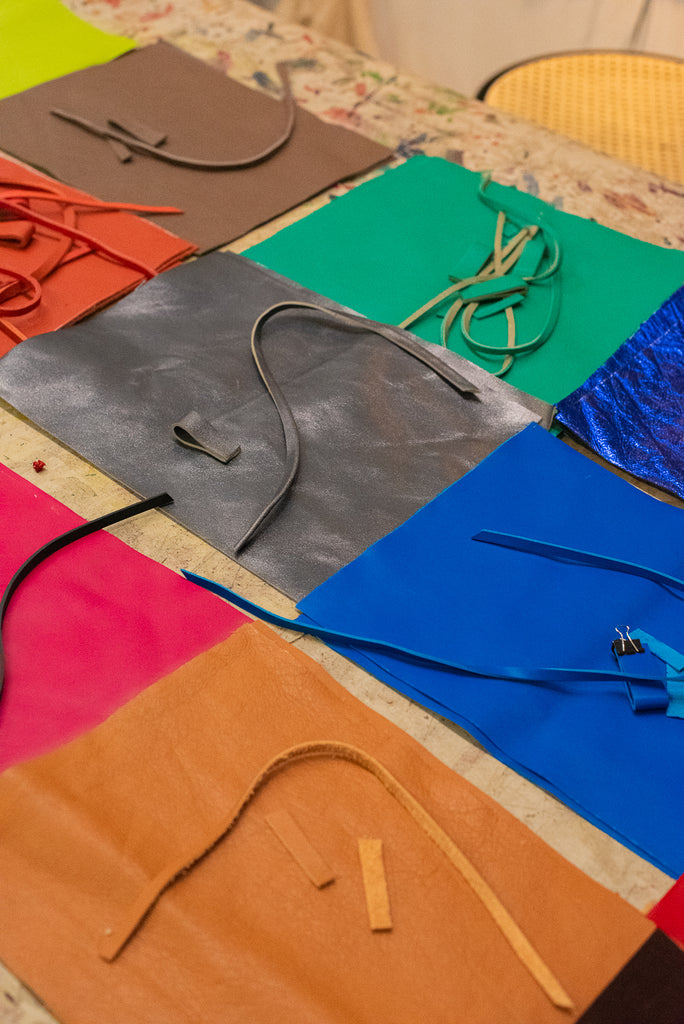 We will start by discovering together the materials and tools to use. Then we will proceed with the practical part: we will choose the color of the leather to use, the small parts (studs, rivets, letters) and the initials to be hot engraved.