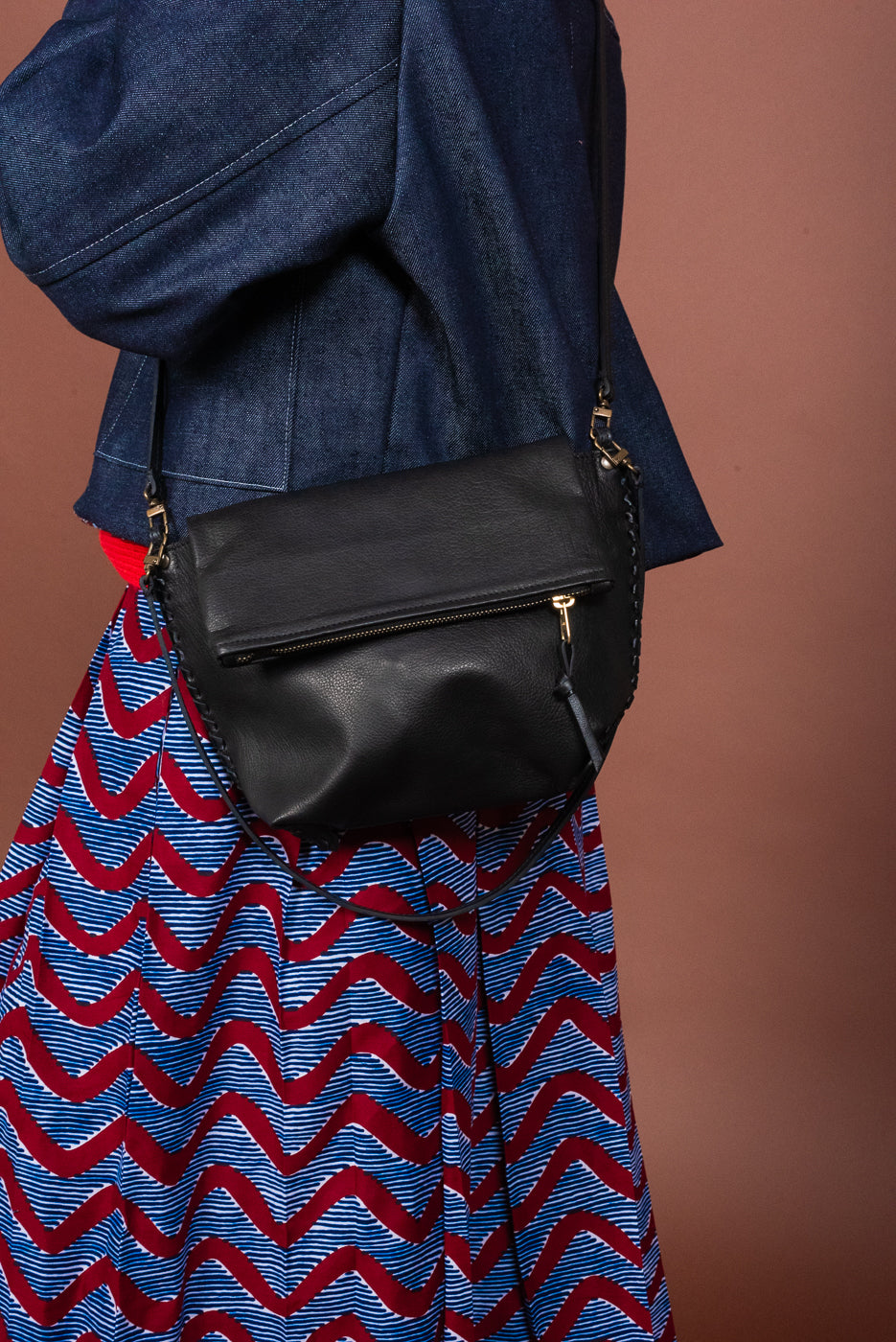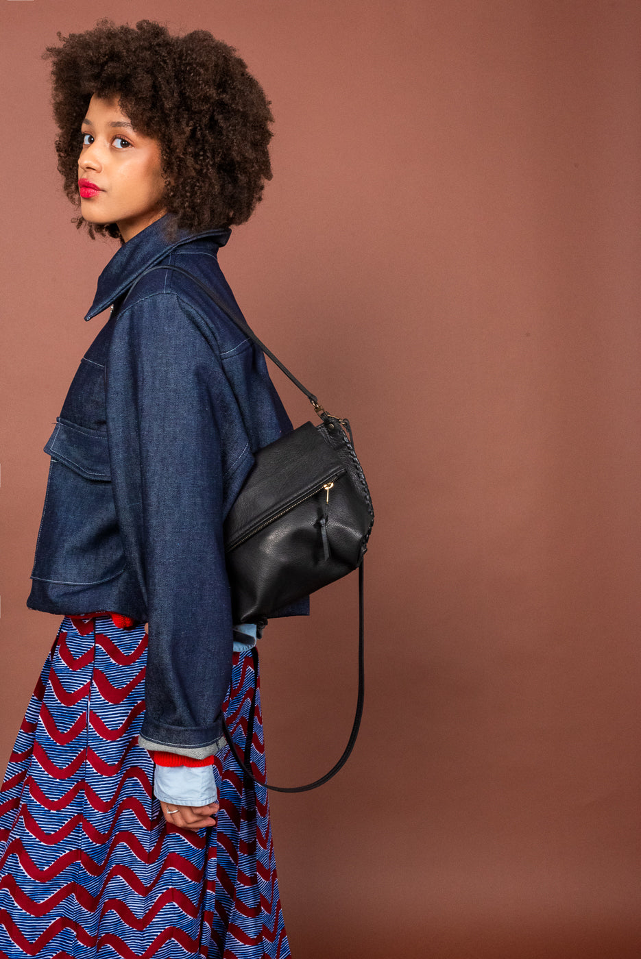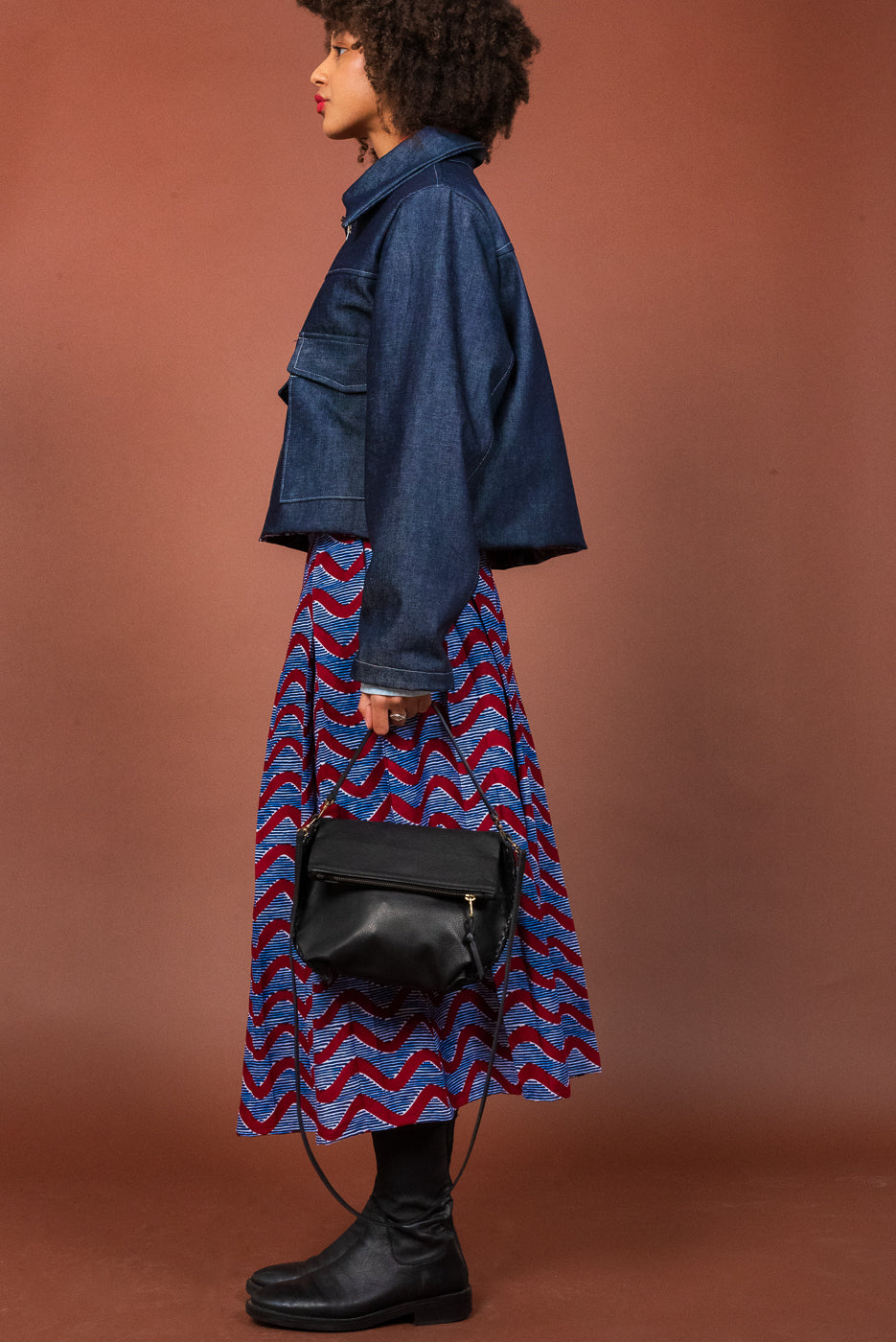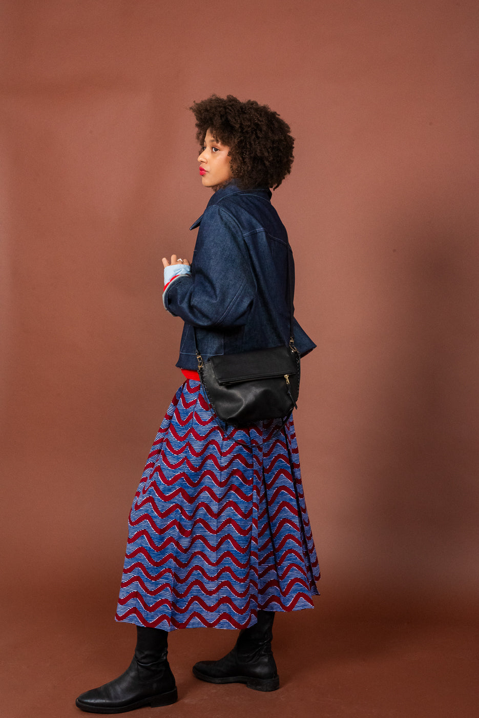 Realizzata in vera pelle con al suo interno una stoffa di cotone Wax, si chiude con una zip ottone e una calamita magnetica nascosta.