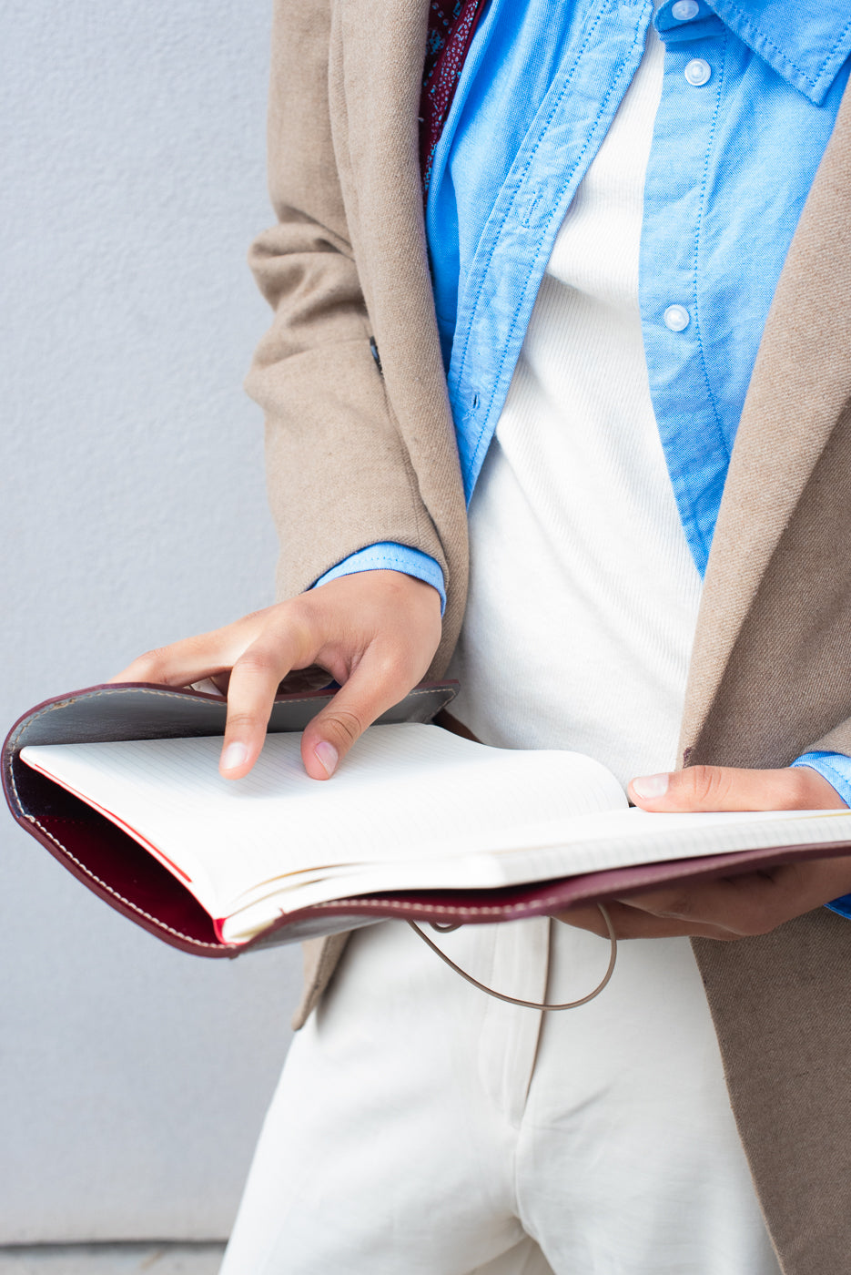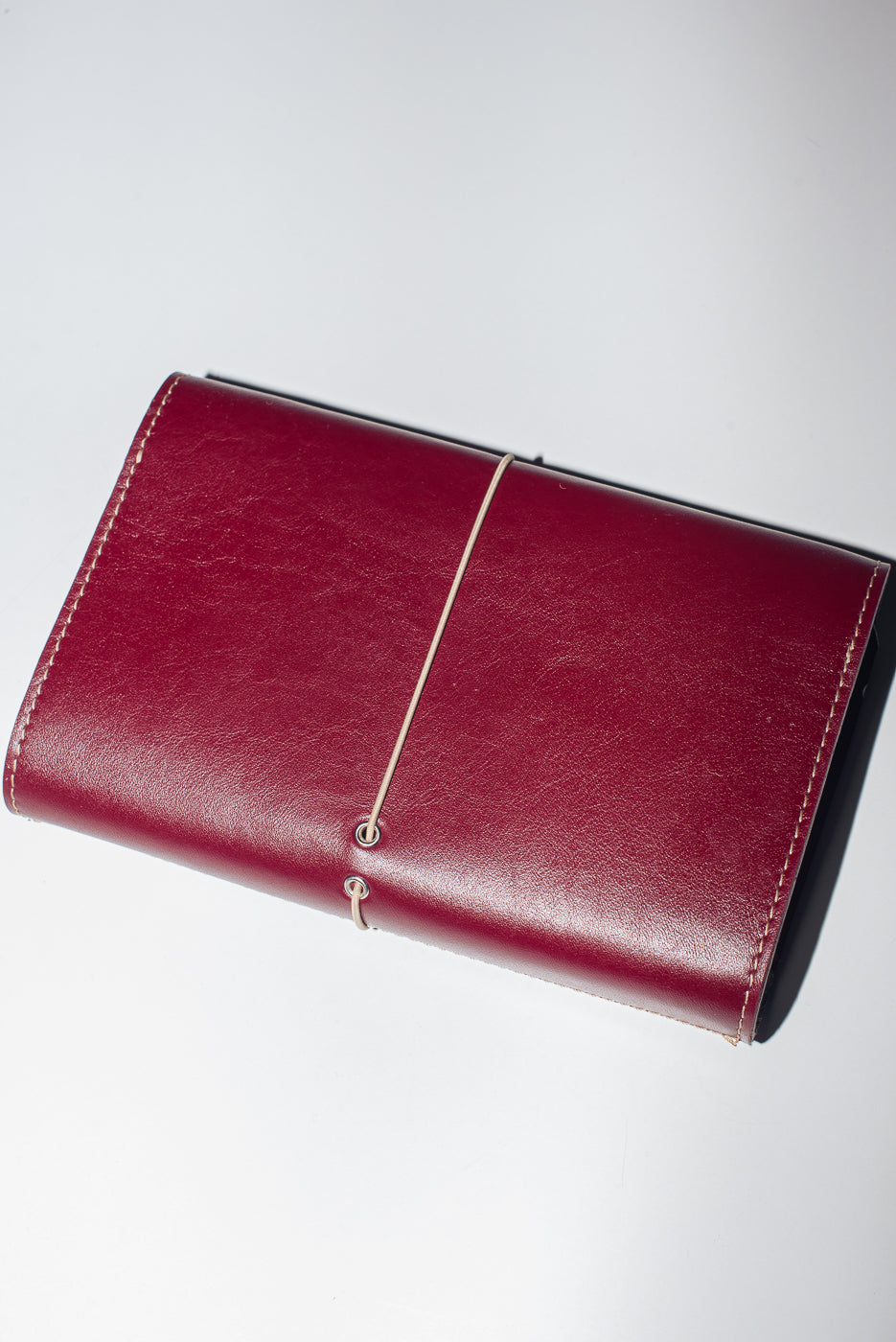 È dotato di una chiusura con elastico avvolgente e di uno scomparto interno pensato per documenti o biglietti da visita. Il logo è impresso a caldo nel suo interno.