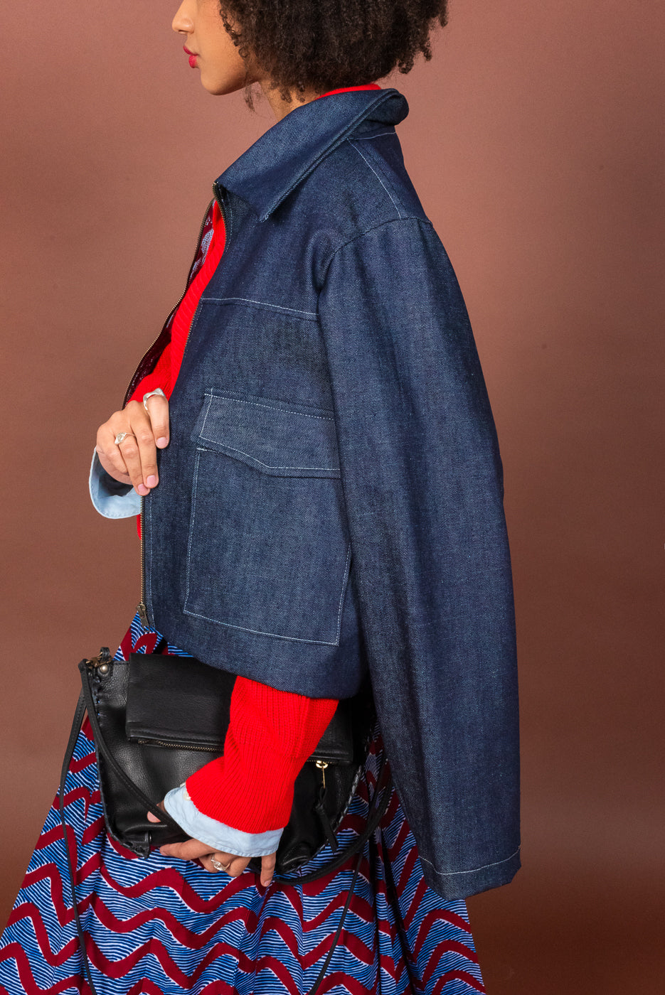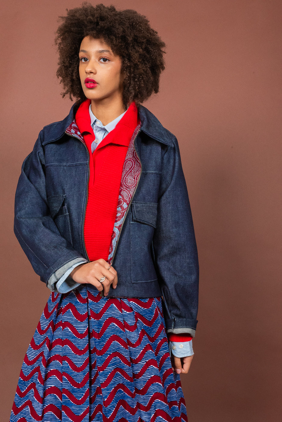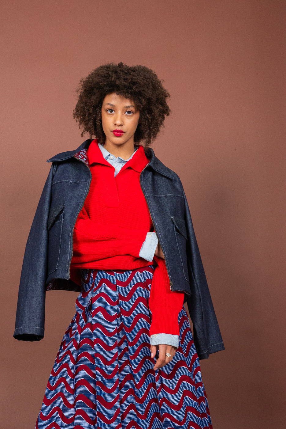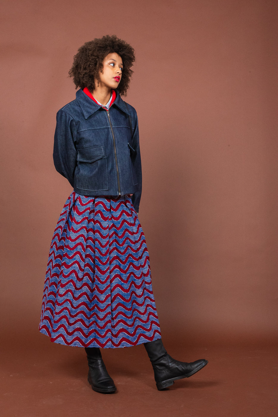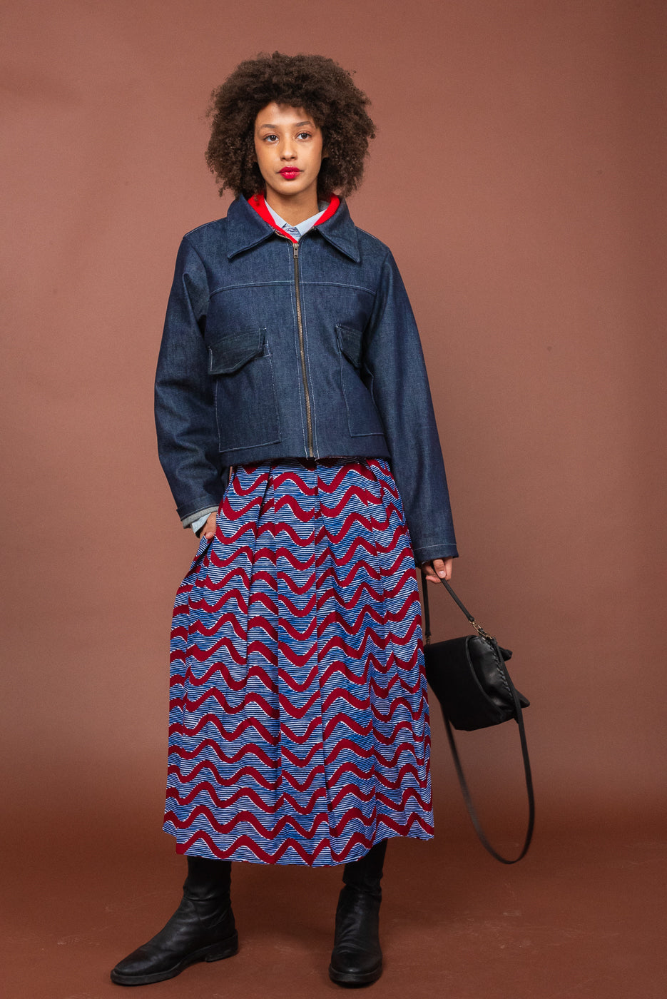 Le stoffe Wax al suo interno sono realizzate in cotone stampato e prodotte con una tecnica di tintura a cera. Tipiche dell’Africa Occidentale, Double Trouble Bologna le acquista a Parigi stagionalmente per realizzare capi di abbigliamento unici e versatili.