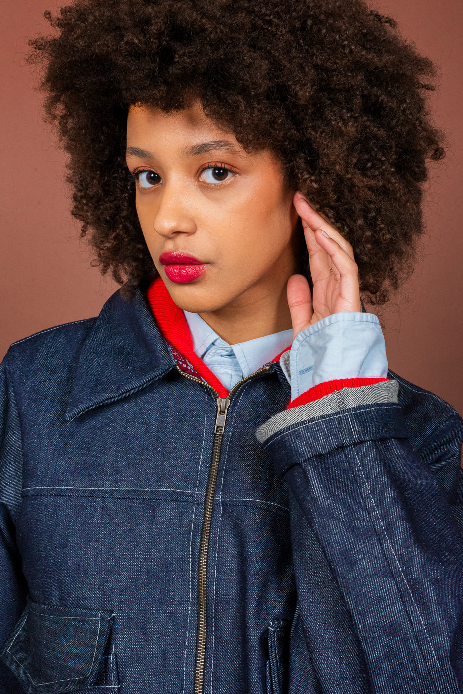 La giacca in denim è realizzata con una chiusura a zip e due tasche anteriori.