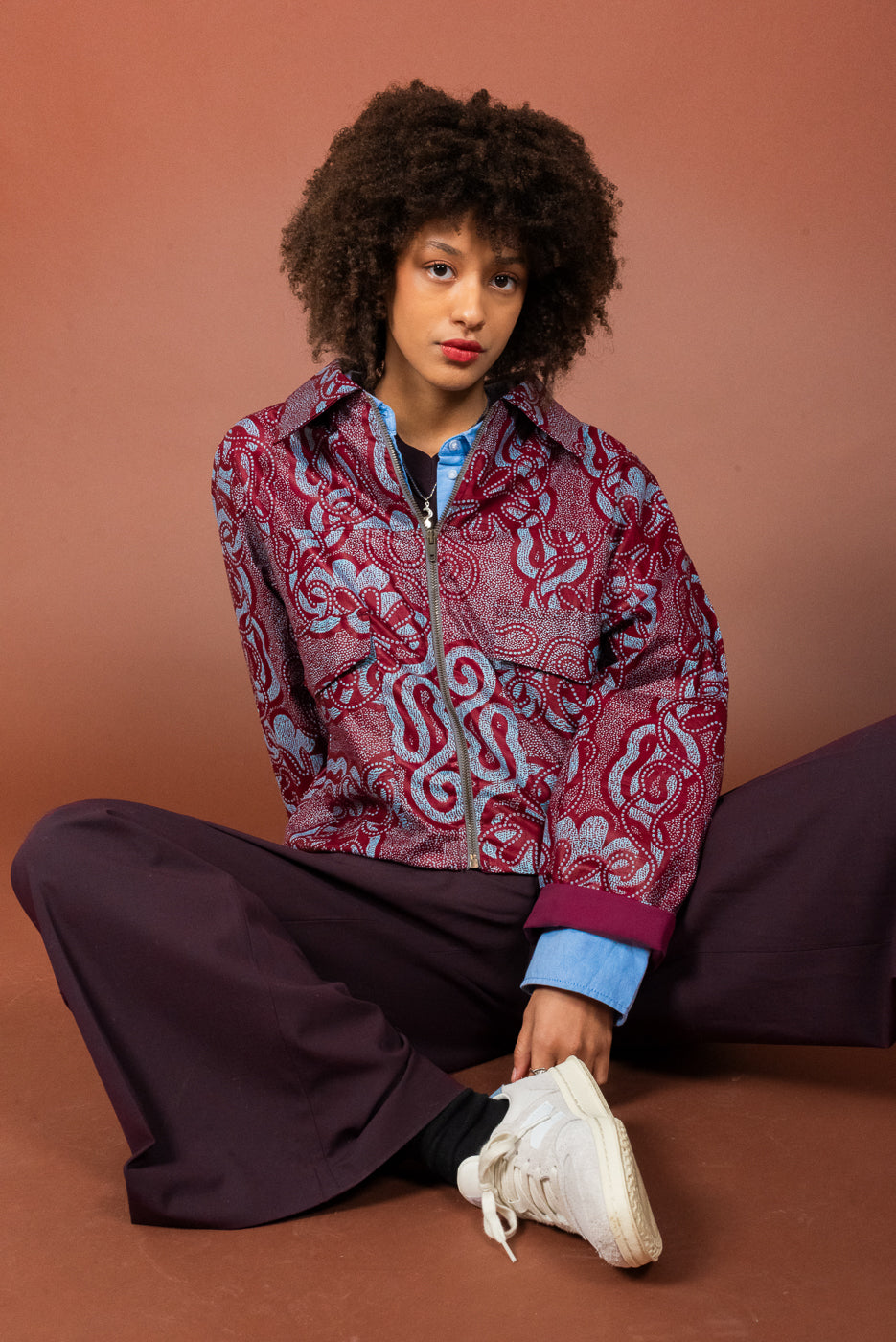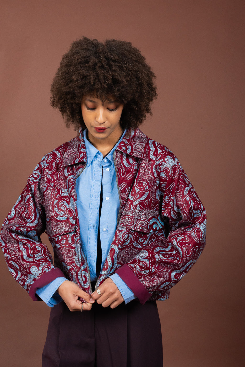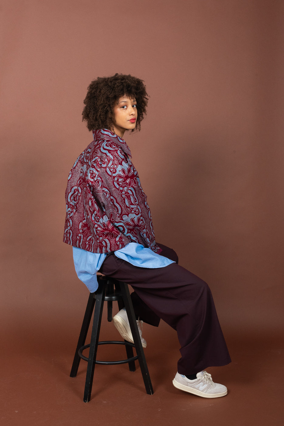 Le stoffe Wax al suo interno sono realizzate in cotone stampato e prodotte con una tecnica di tintura a cera. Tipiche dell’Africa Occidentale, Double Trouble Bologna le acquista a Parigi stagionalmente per realizzare capi di abbigliamento unici e versatili.