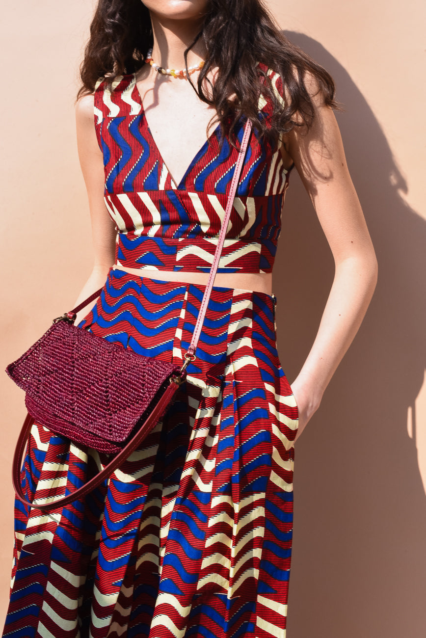 Le stoffe Wax sono realizzate in cotone stampato e prodotte con una tecnica di tintura a cera. Tipiche dell’Africa Occidentale, Double Trouble Bologna le acquista a Parigi stagionalmente per realizzare capi di abbigliamento unici e versatili.