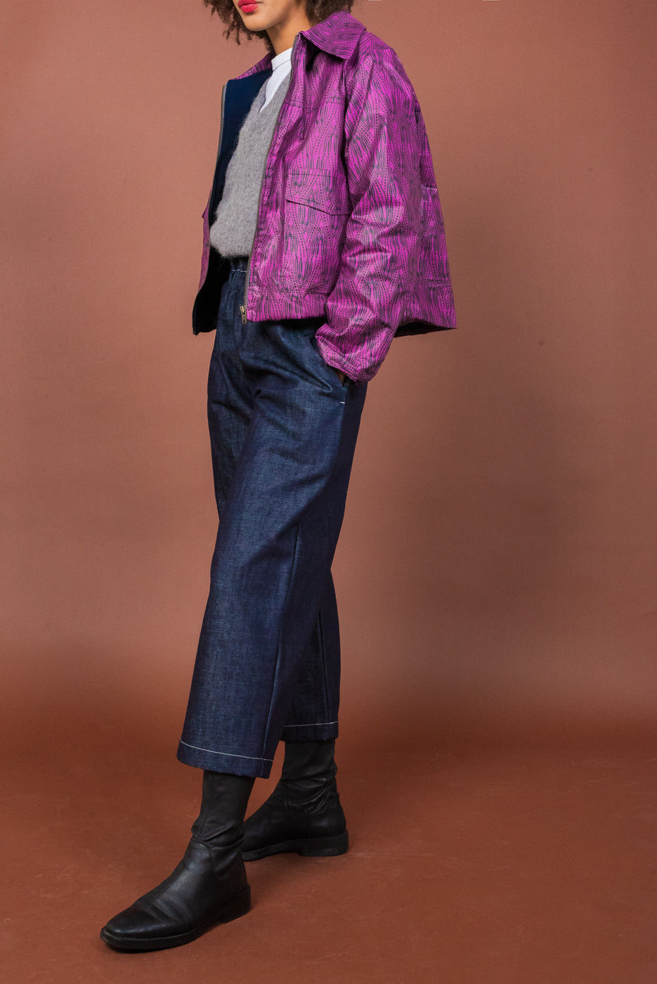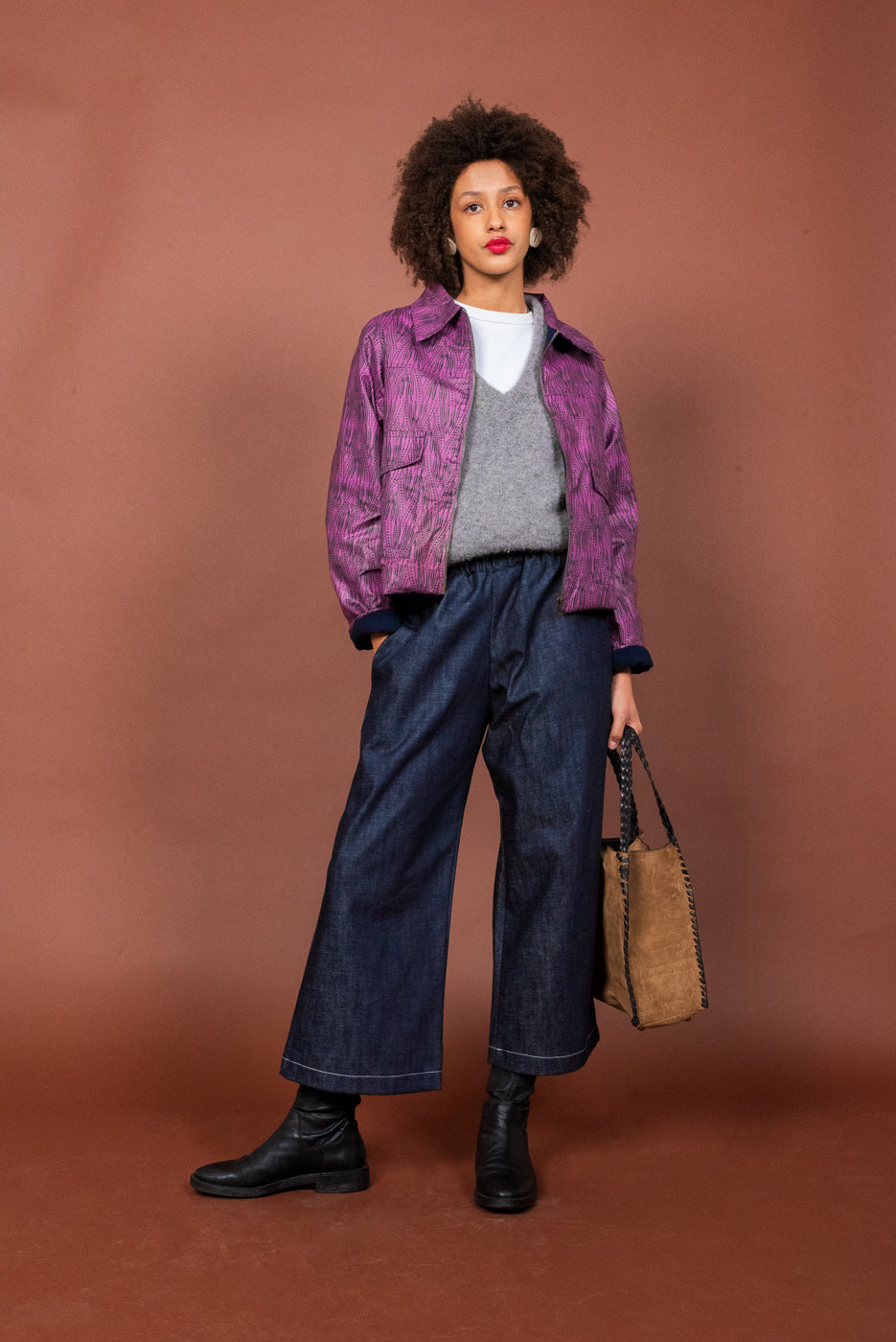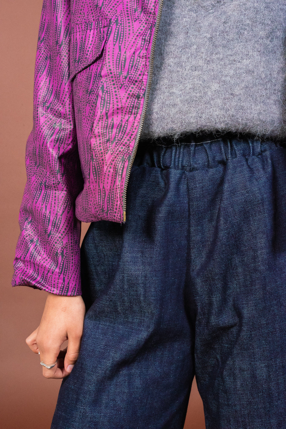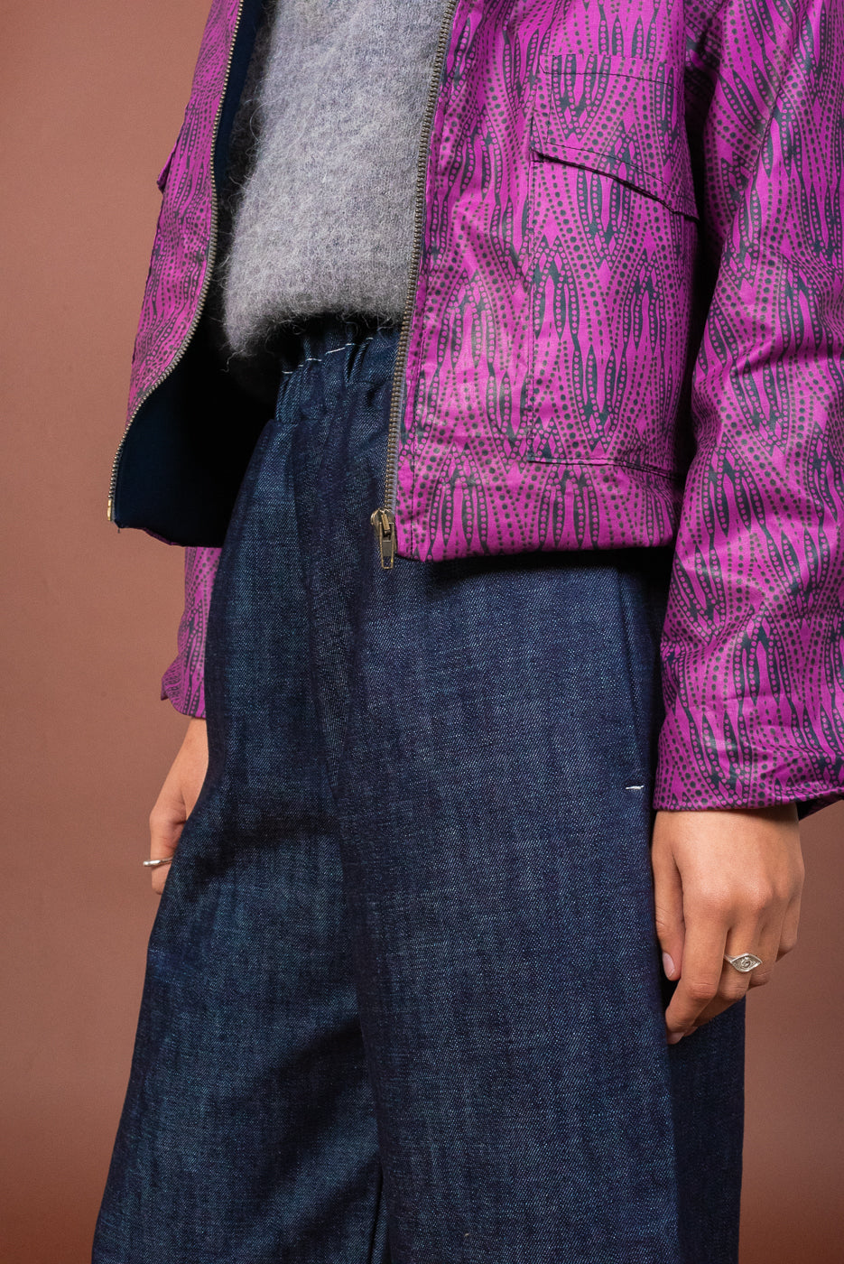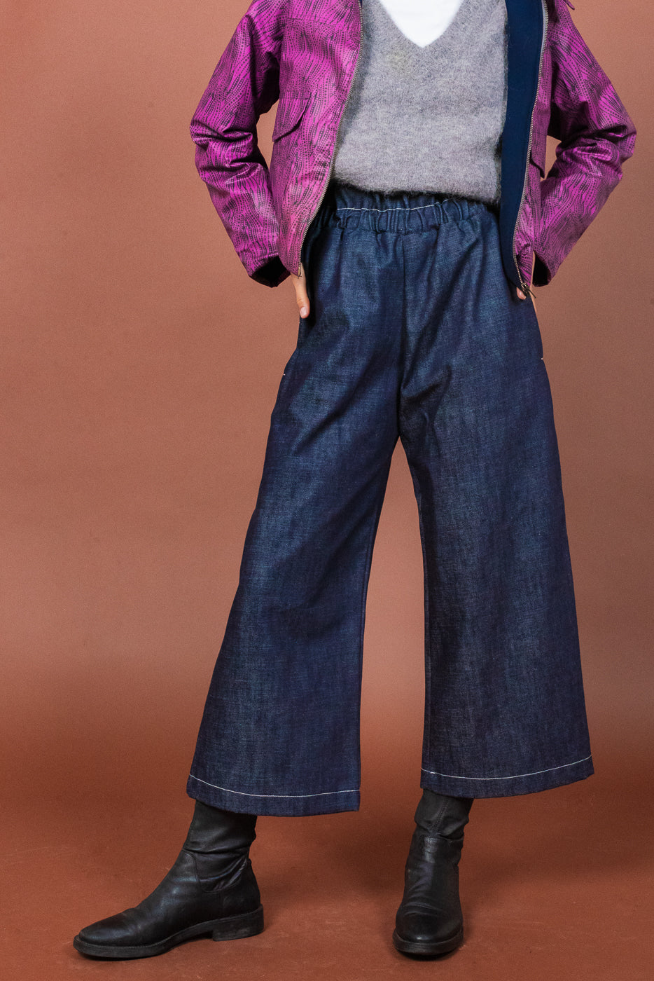 Il pantalone a vita alta in denim è caratterizzato da una gamba ampia e da un elastico in vita. Le tasche sono profonde e foderate di Cotone Wax.